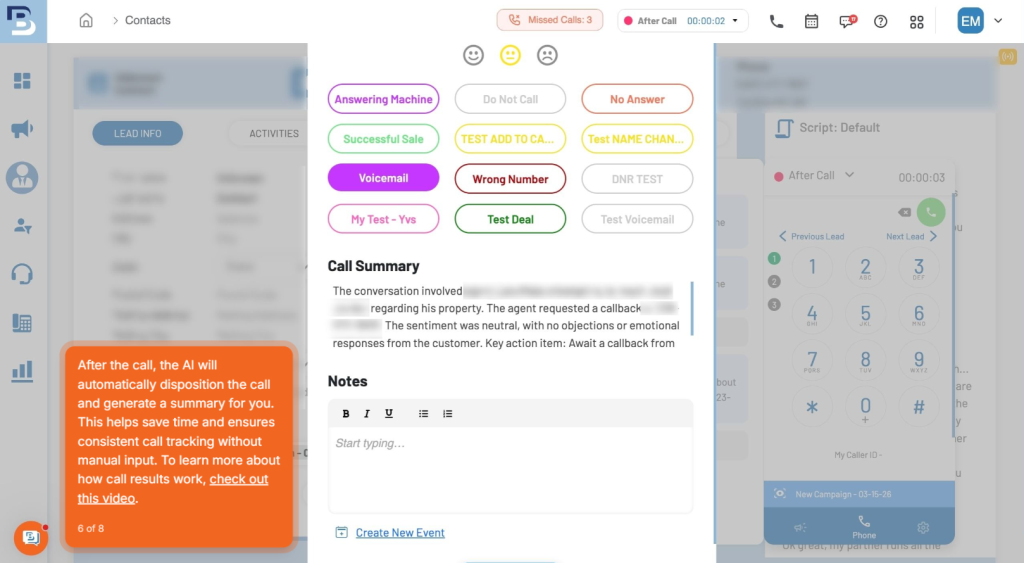 AI-generated Call Summaries in BatchDialer automatically capture key conversation points, objections, and next steps as soon as the call ends.